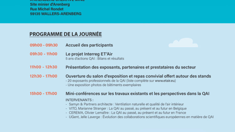 Les partenaires du projet Interreg ET’Air organisent leur évènement de clôture à Arenberg Creative Mine (lieu de tournage de la série Germinal) le 22 septembre prochain de 9h à 17h. Il s’agira d’une journée de conférences, d’une exposition, d’un salon