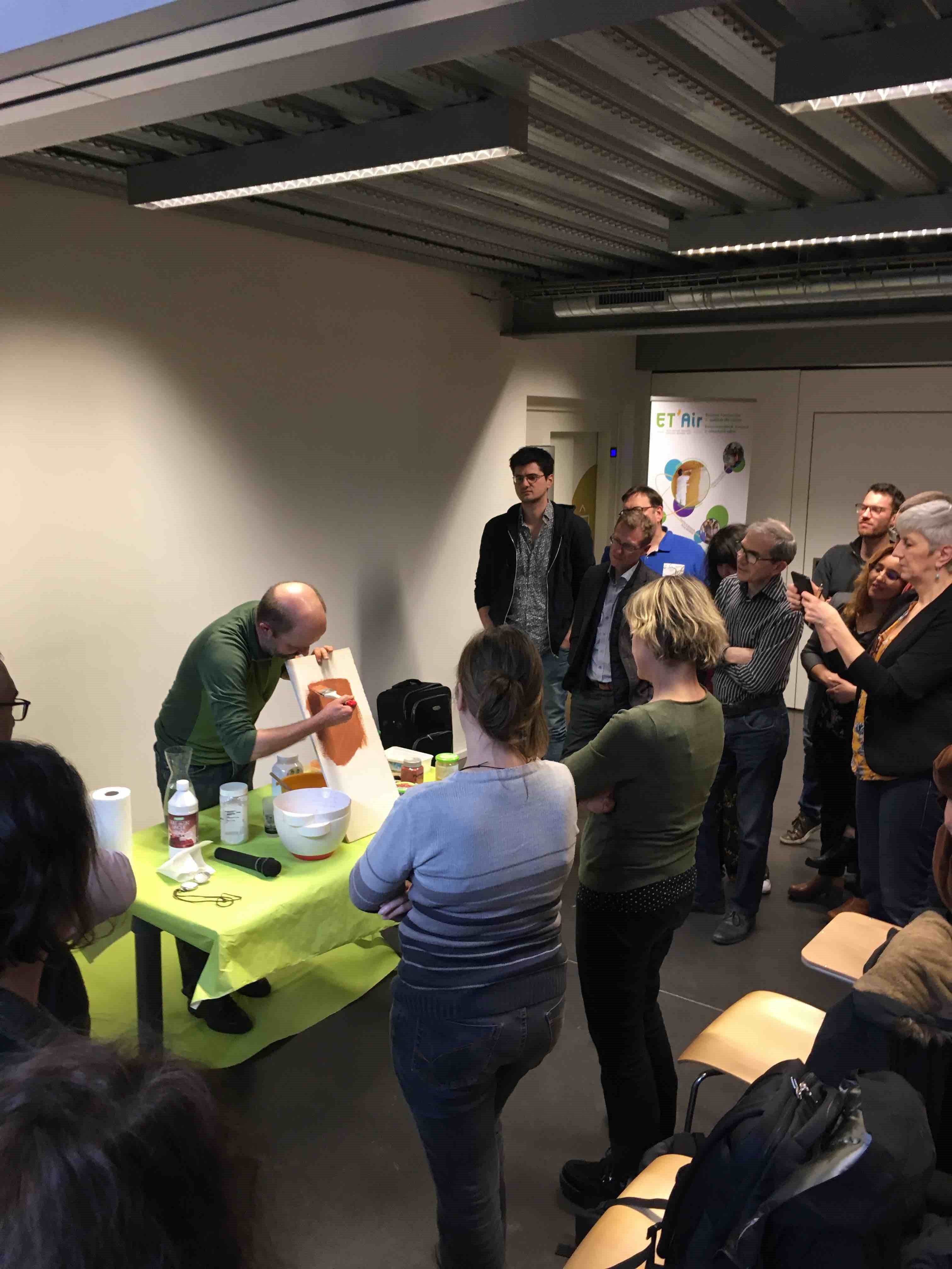 Lors de cet atelier pratique, Etienne DELOOZ a fabriqué une peinture à l’argile 100 % naturelle et l’a appliquée sur une plaque de plâtre. Cet atelier a été l’occasion d’échanger avec les participants et d’évoquer un grand nombre d’anecdotes sur le sujet des peintures naturelles et synthétiques.